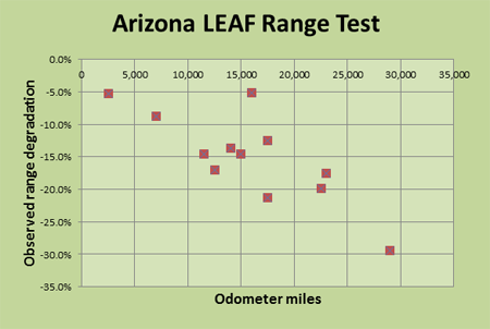 Un propietario que roza los 100.000 km no ha perdido ni una barra a pesar de que conduce en un clima donde la temperatura se mueve siempre alrededor de los 25º. La mayoría de los que han perdido más capacidad ven a menudo temperaturas de más de 35ºC. Siete propietarios que han perdido dos barras se las han visto con temperaturas superiores a 35ºC habitualmente. Otros datos recabados en el foro MyNssanLeafForum de propietarios que han perdido hasta 4 barras pertenecen a Leafs que se mueven en zonas donde las altas temperaturas del verano sobrepasan muy a menudo los 40ºC.