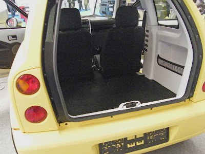Primero un vistazo al exterior, que ya conocemos del Salón de Gijón. Unos materiales plásticos similares a los del Smart y unas juntas menos cerradas de lo esperado. Una de las cosas que más llama la atención es la gran distancia entre el borde del coche y el interior que puede dificultar la entrada a más de uno. Al abrir el portón de cristal que da acceso al maletero nos quedamos sorprendido por el enorme hueco que disponemos, si optamos por la versión con solamente dos asientos, los otros dos son una opción. Sin exagerar, dos personas se podrían sentar en el comodamente en posición lateral, una pena que no tenga apenas espacios ni ningún elemento para sujetar la carga.