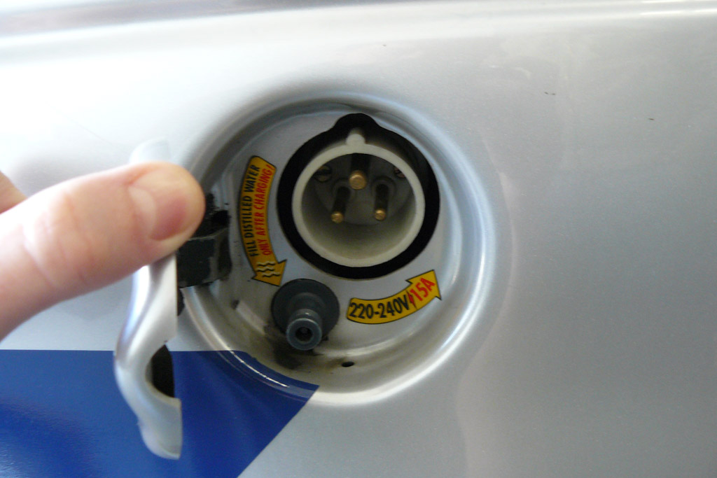 Las baterías suman 48v y 195Ah (9,36kWh) y son de plomo-ácido de tipo abierto, de modo que requieren controlar el nivel del electrolito añadiendo periódicamente agua destilada, mediante un manguito accesible desde la toma de recarga eléctrica.