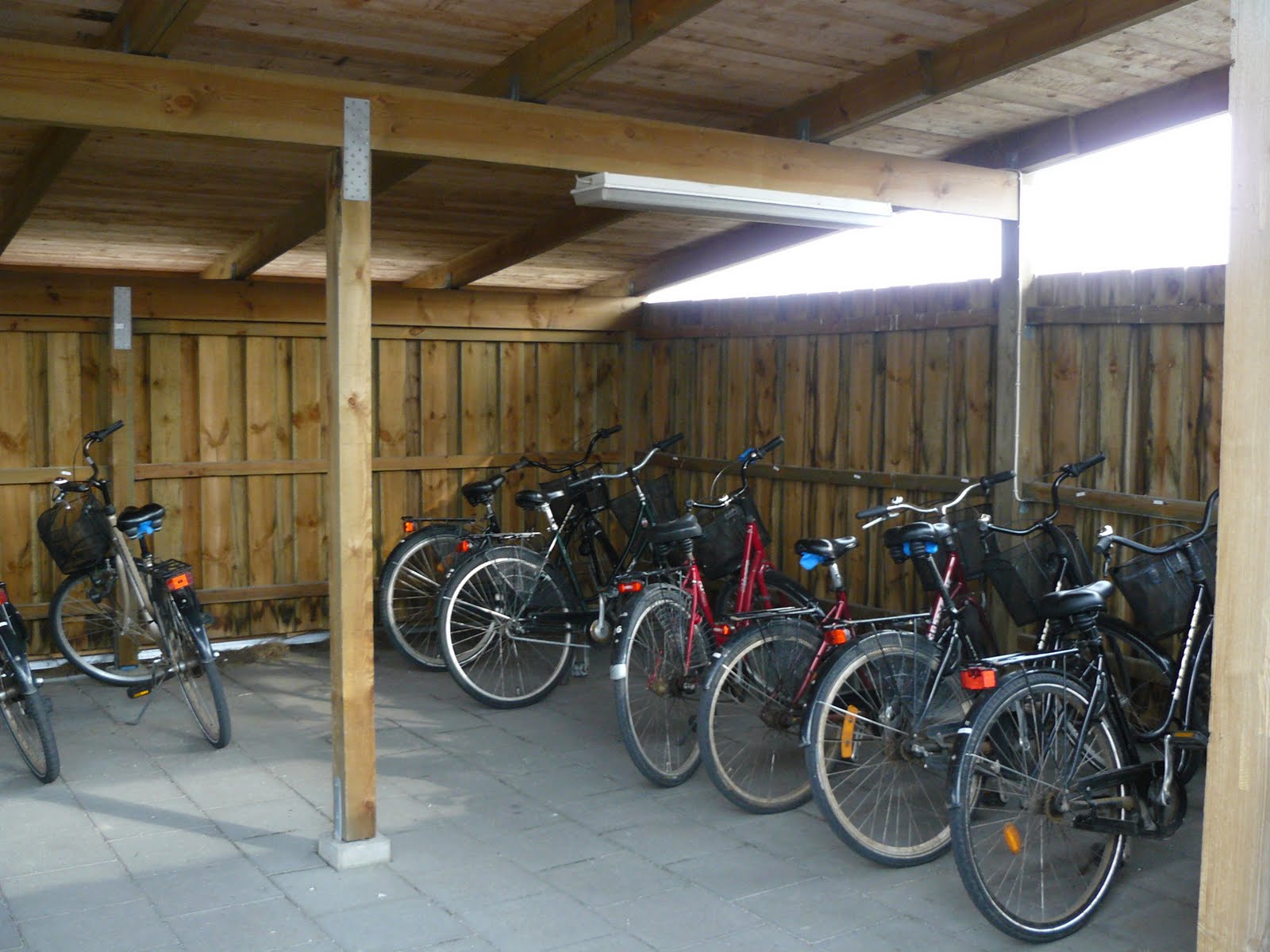 Una sencilla caseta de madera de construcción económica, es suficiente para que los usuarios de bicicletas, que se cuentan por miles, puedan aparcar durante la noche sus vehículos, quedando protegidos del mal tiempo característico de la zona.