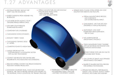 El T27, desarrollado conjuntamente con Zytek, estará basado en el modelo gasolina T27 al que han sustituido su motor térmico por uno eléctrico de 34cv, con un par de 87nm desde cero revoluciones y una velocidad máxima de 105kmk. Dispondrá de un pack de baterías de litio de 12kwh de capacidad que le permiten recorrer entre 120 y 160 kilómetros con cada carga. El peso es de solamente 680kg y alcanza los 100km/h en unos 15 segundos. El T27 está pensado por y para la ciudad, donde por su tamaño y su excelente radio de giro de 6.1 metros le permiten maniobrar y aparcar casi en cualquier sitio.
