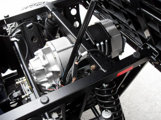 El grupo propulsor se compone de un motor trifásico de inducción, que a tan sólo 48v rinde un máximo de 30CV, un controlador Sevcon multimodo con freno regenerativo y una robusta reductora que se encarga de la transmisión. La propulsión es trasera, aunque a la mínima pérdida de tracción, entra en funcionamiento el modo 4×4, mediante un acoplamiento momentáneo del diferencial delantero.