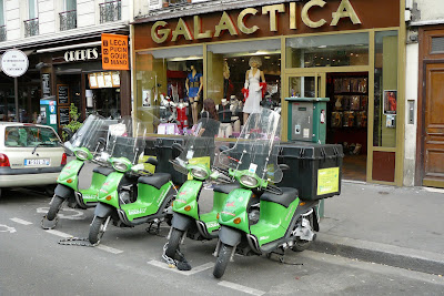 Paseando por las calles de París, en la zona cercana al Sacré Coeur (Sagrado Corazón), encontramos un punto de recarga en pleno funcionamiento, recargando las baterías de 2 motocicletas de reparto, mientras otras 2 estaban en espera.