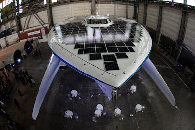 La energía del Planetsolar proviene de 536 metros cuadrados de paneles fotovoltaicos que alimentarán los cuatro motores con los que cuenta. Estos tendrán una potencia máxima de 126cv que le permitirán alcanzar una velocidad de 25km/h y estarán alimentados por un pack de baterías con una autonomía de…bueno, mientras tengas sol, aunque puede funcionar durante las noches pero el fabricante no indica durante cuanto tiempo.