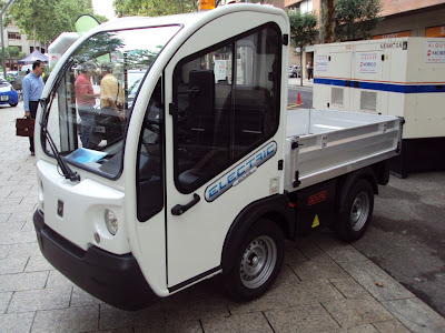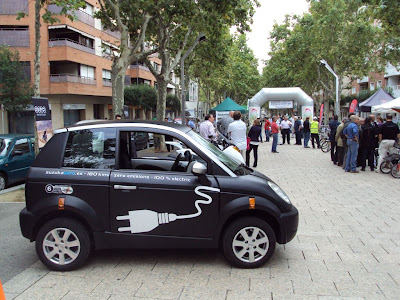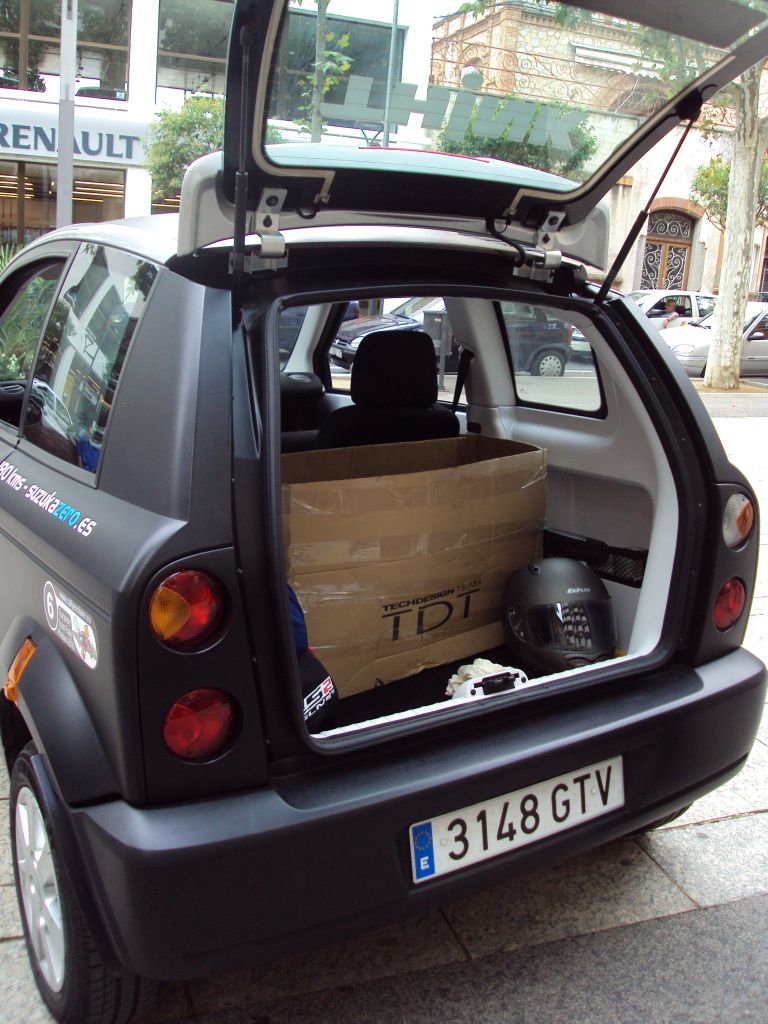 Por último el Think city, situado a medio camino entre el Reva y el Mitsu. Carísimo para lo que ofrece, por lo que Suzuka zero no ha vendido ninguno en 3 años. Intentan colocarlos a las empresas (aguas de Barcelona, aguas de Tarragona, etc) para mantenimiento, pues caben 2 operarios y su material, pero de momento ni con leasing (730€/mes) ni pregonando un coste de 0,6€/100km sin mantenimiento. Lo curioso es que la parte exterior es todo de fibra, como si parachoques se hubiese comido toda la pintura.