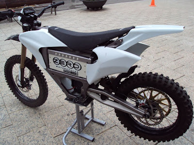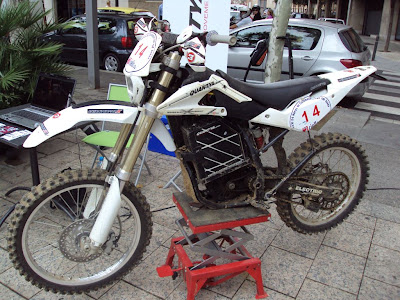 La más espectacular, la Quantya de competición (con su barro y un portátil para ver el vídeo de la carrera), con una gran batería sujeta por una cinta. Me quedé con la duda de si la cinta era para los repostajes o una solución provisional. La salida del motor pasa por un eje intermedio con piños antes de llegar a la rueda para reducir el tamaño del plato. Tampoco pregunté el peso del conjunto, pero los suizos no han escatimado en suspensiones.