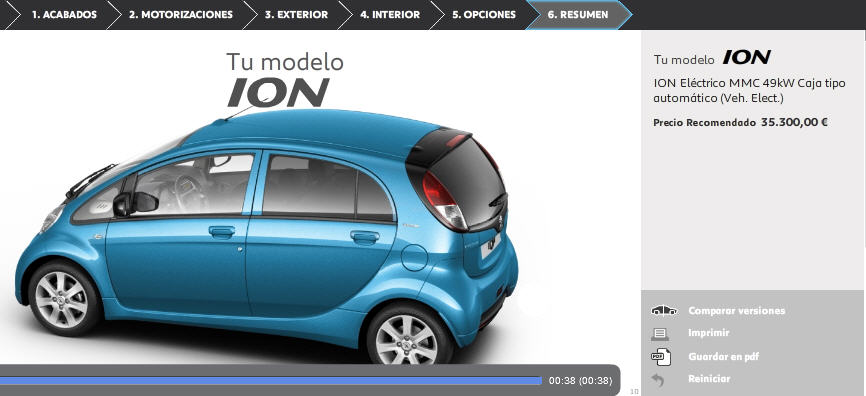 En cuanto al delicado tema del precio, como sus hermanos Miev y C-Zero no será precisamente económico y la versión con pintura metalizada nos da un total de 35.300 euros a los que deberemos restar la ayuda de 6.000 euros, quedando un total a pagar de 29.300 euros, una cifra a todas luces exagerada ya que apenas difiere unos pocos cientos de euros del Nissan Leaf, un coche más grande y con mejores prestaciones.