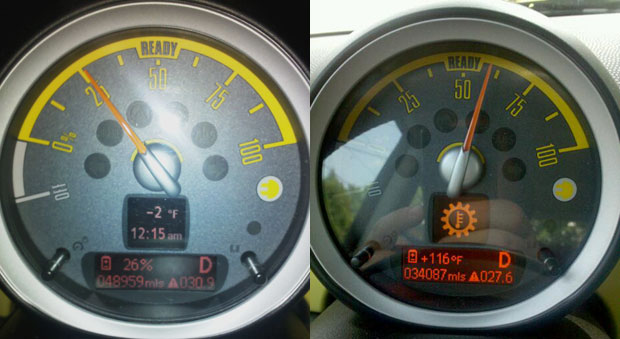 Lo deja claro desde un principio, “He hecho cosas que tal vez no habría hecho si fuese de mi propiedad” Y es que después de 86.400 kilómetros en 22 meses, más de 1.000 recargas, una media de 1.5 por día, y en un ambiente que ha variado desde los 6 grados bajo cero hasta temperaturas de más de 30, el Mini se ha comportado de una forma extraordinaria. Precisamente es uno de los datos más interesantes y es que Tom no ha reportado pérdida de autonomía cuando la temperatura ambiental ha sido extremadamente baja, ni cuando esta ha alcanzado cifras elevadas, mientras que otros modelos, como el Volvo C30 eléctrico, puede llegar a una pérdida del 40%.