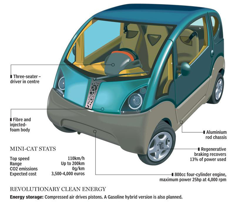 Aunque parezca el mismo artículo siempre, de nuevo vuelve a aparecer en la escena el motor de aire, una quimera desarrollada por la francesa MDI que plantea la posibilidad de sustituir las baterías de los coches eléctricos por aire comprimido que impulsaría al coche. Ahora, le toca el turno al fabricante indio Tata, que está desarrollando una nueva versión de este modelo denominado Mini Cat Air Car, en lo que parece una carrera perdida antes de comenzar.