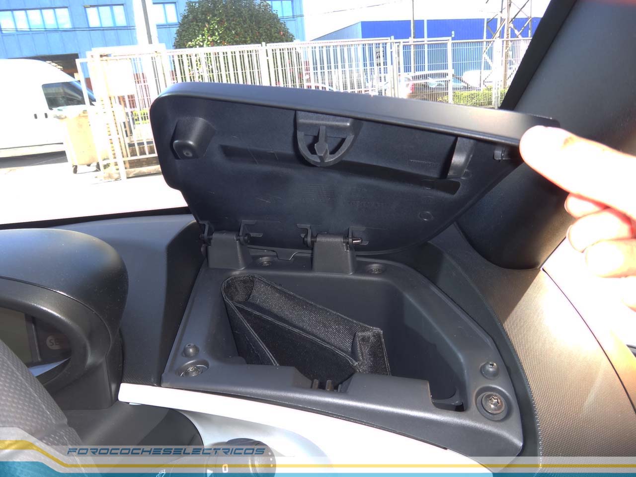 En cuanto a la zona de carga, 60 litros declara Renault que tiene el Twizy, pero lo que encontramos tras abrir el asiento trasero es un hueco totalmente vertical en el que podremos introducir un ordenador portátil o una tablet, pero donde los objetos más pequeños caerán hasta la parte inferior, momento en el que tendremos que introducir el brazo y recuperarlos a ciegas y con un poco de esfuerzo, por lo que su uso es casi testimonial, teniendo que usar el asiento trasero como maletero.