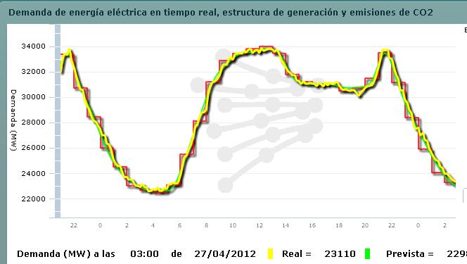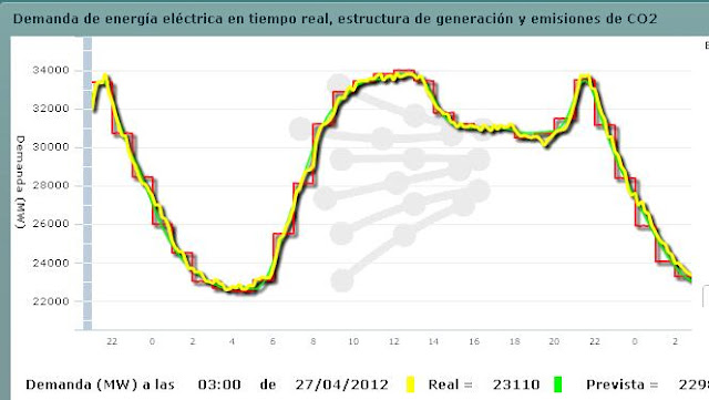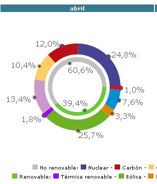 Estos porcentajes son medias diarias, pero aunque por la noche cae el consumo ni las centrales nucleares ni las eólicas salvo riesgo de caída, detienen su producción por lo que en horario de recarga nocturna de coches eléctricos probablemente este mes haya superado un 75% sin producción de gases contaminantes tóxicos o CO2. Este último dato carece del más mínimo rigor y es una simple estimación mía personal basado en que la demanda máxima anda por los 34.000 GWh y la mínima por los 23.000 GWh
