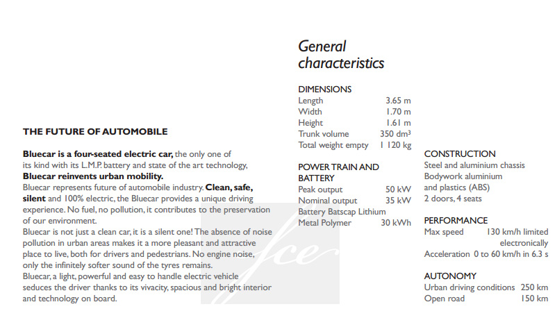 Diseñado por Pininfarina, el Bluecar es un modelo que lleva una larga trayectoria como prototipo a sus espaldas, una denominación que ha abandonado el pasado año cuando ha comenzado a funcionar dentro del ambicioso programa de car sharing de la ciudad de París, donde ya ha alcanzado la cifra de 1.000 vehículos, repartidos en 250 estaciones de alquiler.
