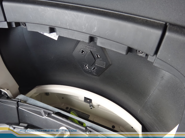 Mención aparte merece el espacio dedicado a guardar el cable de recarga, donde también encontramos el depósito para el líquido del limpiaparabrisas, una sencilla tapa de plástico sin ningún tipo de cierre, que deja a esa zona totalmente desprotegida. En el lado positivo, encontramos que el cable está fijado en el coche, por lo que en el peor de los casos, solamente podrán cortarlo, aunque esto nos obligará a pasar por caja en el concesionario para afrontar su sustitución.