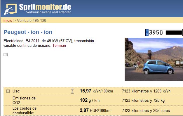 Los dos ejemplos que hemos encontrado nos indican que en uso real, el propietario del Peugeot iOn ha logrado en los 7.123 kilómetros recorridos hasta le momento, una media de consumo de 16,97 kWh cada 100 kilómetros, que le ha supuesto un gasto medio de 2,87 euros cada 100 kilómetros.