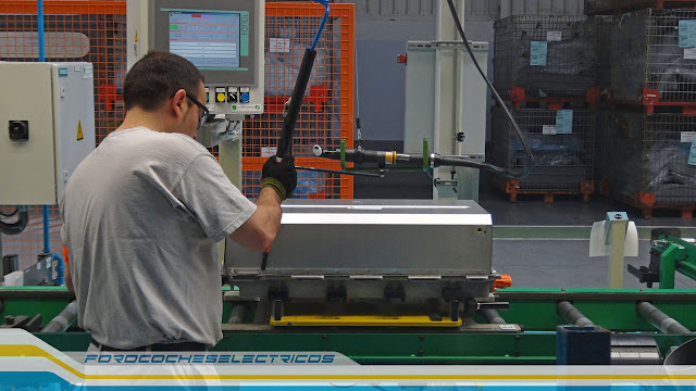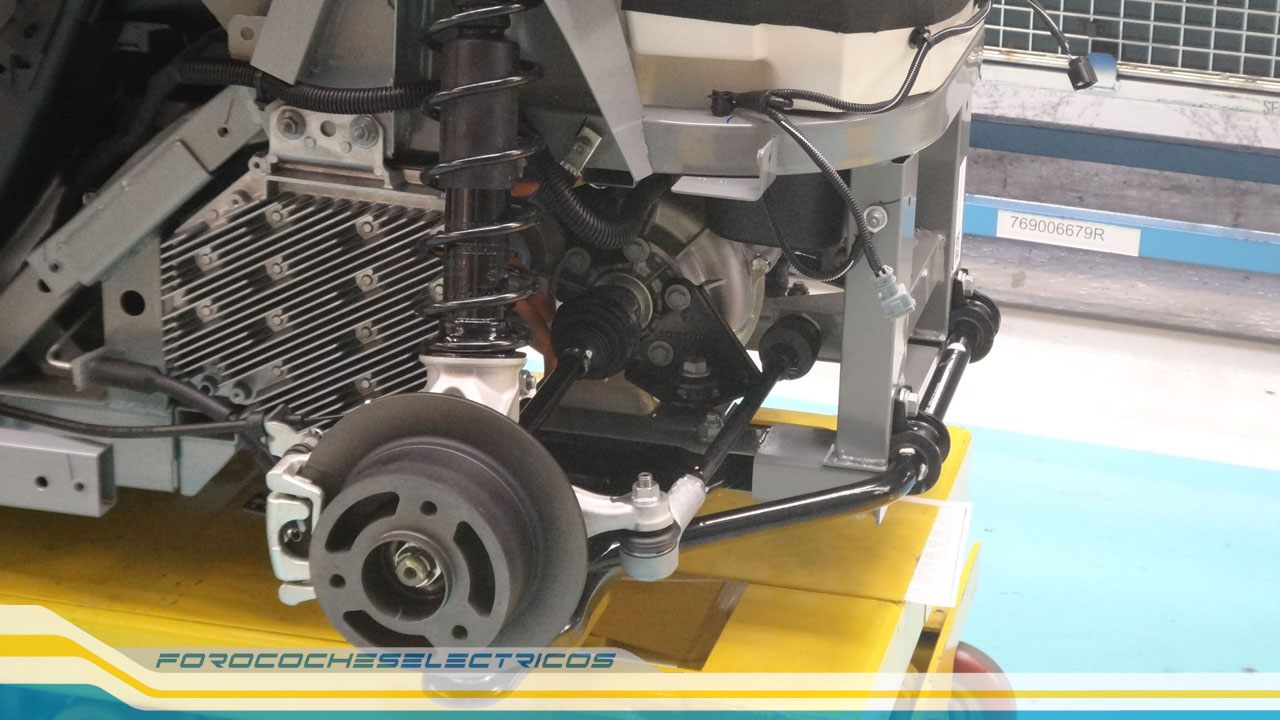 En la siguiente zona es donde se ensamblan las principales piezas, y partiendo de los chasis que llegan a esta zona con la estructura ya terminada, los operarios comienzan a instalar el motor, la batería y todos los componentes electrónicos necesarios para hacer funcionar a este vehículo, y que en apenas unos metros ya dispone de todos los elementos necesarios para su funcionamiento.