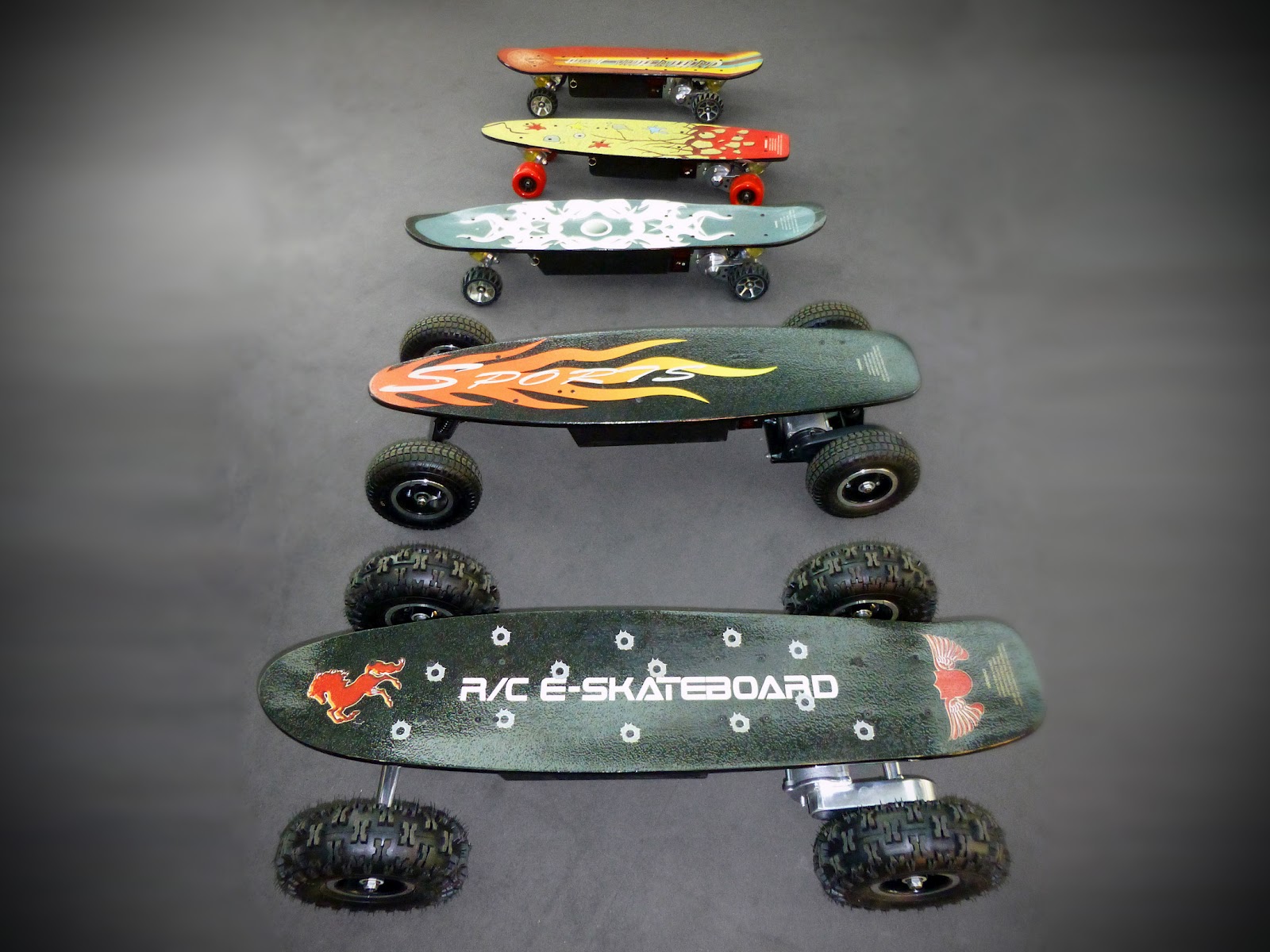 Comparten algunas características; montan batería de gel extraíble, motor con escobillas y tanto el acelerador como el freno –regenerativo– se controlan mediante un gatillo inalámbrico. Todos tienen tracción a una de las ruedas posteriores, dado que no tienen diferencial y un eje rígido complicaría en gran medida los giros, que se hacen como en cualquier skate, inclinando la tabla con los pies. El peso de la batería no es problema porque queda muy cerca del suelo, aunque pronto habrá baterías de litio para ampliar la autonomía, que es de unos 15-25 km.