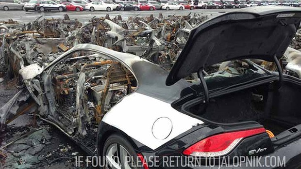 Entra tanta destrucción hemos encontrado a 16 Fisker Karma preparados para su entrega que han sido totalmente destruidos por el huracán a su paso por el puerto de New Jersey, a donde habían llegado para su distribución a diferentes partes del país, y que como podemos ver en las fotos, han quedado completamente inutilizados. Lo más curioso es que los vehículos han quedado atrapados bajo el agua, y posteriormente han comenzado a arder de forma espontánea, una doble desgracia para Fisker que incluso en medio de un huracán, no puede evitar que de nuevo recordemos los casos de incendios espontáneos que han vivido varias unidades en los últimos meses.
