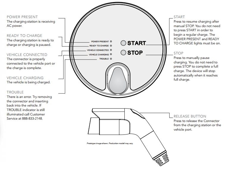 A nivel operacional incorpora pilotos de aviso de presencia de corriente, listo para cargar, vehículo conectado, vehículo cargando y un piloto para aviso de problemas. Un botón de inicio y otro de parada nos permiten iniciar, pausar, reanudar o parar la carga desde la estación. La estación detecta el final de la carga y para por si sola y la manguera lleva un seguro en el conector que permite interrumpir la carga también. Además en caso de tirón accidental fuerte del cable, por ejemplo si nos dejamos el coche un poco en cuesta sin freno de mano, el cable se desprende de la estación para prevenir la rotura.