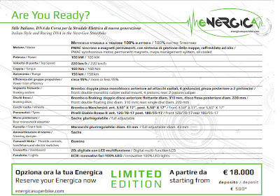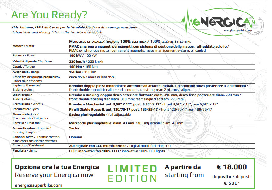 La Energica cuenta con un diseño agresivo y un aspecto de verdadera superbike de carretera, una presentación donde podemos ver frenos de verdadera motocicleta, con discos frontales Brembo de 310mm y cuatro pistones, y suspensiones de primera calidad firmadas por los prestigiosos ;Sachs y Marzocchi. Pero sin duda el gran protagonista de este conjunto es el motor, un monstruo de 100 kW con un par motor de 160 Nm, capaz de arrancar el asfalto durante la aceleración.