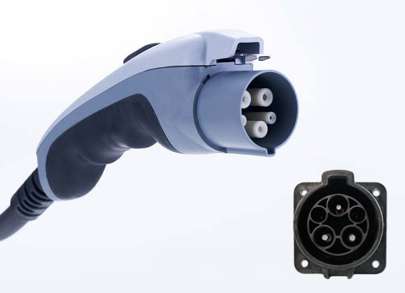CHAdeMO es el nombre de una asociación japonesa formada por la Tokyo Electric Power Company (TEPCO), Nissan, Mitshubishi, Fuji Heavy Industries (Subaru) y Toyota. El conector conocido como CHAdeMO fue diseñado por la TEPCO. El nombre CHAdeMO deriva de la frase japonesa “ocha demo ikaga desu ka” que significa más o menos “¿que tal si tomamos un té?”, haciendo referencia a los escasos minutos que son necesarios para recargar el coche, el tiempo de tomar una taza de té. Oficialmente sin embargo se supone que es la abreviatura de CHArge de MOve o CHArge for MOving. Es un conector para modo 4, en corriente continua, que proporciona actualmente hasta 62,5 kW de potencia. La comunicación con el vehículo es por CAN bus. Como buenos hijos del imperio del sol naciente el Nissan Leaf y los trillizos tienen esta opción de carga.