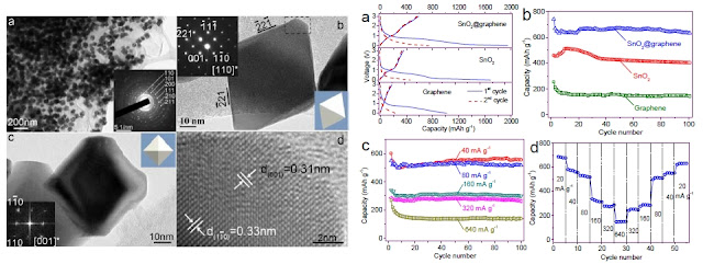 Investigadores de la Universidad de Sídney, Australia, en colaboración con la Universidad de Gyeongsan, en Corea del Sur han publicado recientemente un ánodo basado en nanocristales de SnO2 usando laminas de grafeno para estabilizar el oxido. Se trata de una estrategia similar a la que vimos para usar silicio en las baterías de ion-litio y que promete una mayor estabilidad del ánodo. Los resultados muestran una capacidad inicial de 1942 mAh/g, superior a la teórica esperada, y un valor a partir del segundo ciclo de 700 mAh/g estable hasta los 100 ciclos.