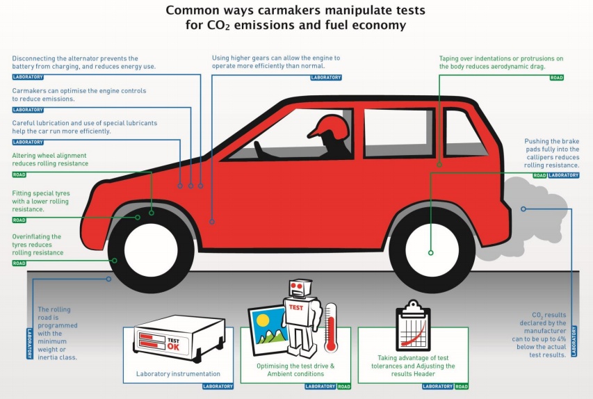 La instrumentación de las pruebas se ajusta también de manera que de los mejores resultados. En el caso del CO2 el fabricante puede declarar hasta un 4% menos de lo que dé la prueba en realidad. Por no hablar de que los métodos de medición son tan relajados que podría ser que en realidad de la supuesta reducción en emisiones de CO2 de los últimos años sólo sea cierta la mitad. O ni eso. Y si no siempre queda retocar los datos tras la prueba. La lista de trucos en la chistera de los fabricantes es muy larga.