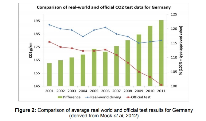 Además el test actual es muy poco representativo de las condiciones actuales de conducción. La diferencia entre lo que declaran los fabricantes a lo que se obtiene en la vida real ha pasado en Alemania por ejemplo del 7% en 2001 al 23% en 2011. En resumen, nos engañan como a tontos.