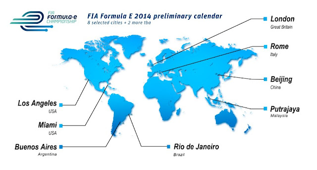 Ya son 8 las ciudades confirmadas para el calendario 2014 de la Formula E, la nueva competición perteneciente a la FIA en la que correrán exclusivamente coches propulsados por motores eléctricos. Tan solo quedan 2 ciudades por confirmar, que serán elegidas entre las 23 que han mostrado interés en albergar la competición.