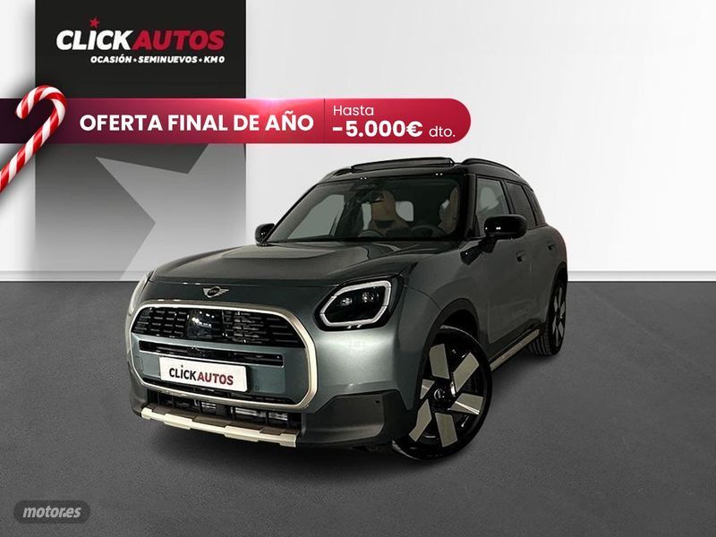 Acabado Cooper Favoured Autom.. Disponible también en los colores Smokey Green. También en Península y Baleares. Este anuncio es meramente informativo, no es vinculante ni contractual. Consulta a nuestros comerciales. Más de 2000 coches en stock permanente, visítenos en ClickAutos. - Sistema de recuperación Mild-Hybrid 48V Caja de cambios Steptronic con doble embrague Active Guard Tele Services Llamada de emergencia obligatoria ACABADO FAVOURED: Volante deportivo calefactable Techo en negro Schwarz Asientos deportivos John Cooper Works Contenidos adicionales específicos de Favoured Trim PAQUETE XL: Dispositivo de alarma con mando a distancia Acceso Confort Enganche eléctrico para remolque Techo de cristal panorámico Cristales tintados para protección solar Paquete de retrovisores interiores y exteriores Reglaje eléctrico de los asientos con memoria Calefacción asientos delanteros Cámara del habitáculo Modos MINI Experience Faros LED Driving Assistant Profesional Parking Assistant Plus MINI Head-Up Display Bandeja para carga inalámbrica Navegación MINI AR