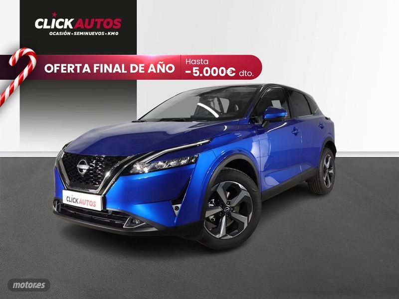 Acabado MHEV N-Connecta. Disponible también en los colores Plata Diamante, Katana grey, Skyline grey, Magnetic blue. También en Península y Baleares. Este anuncio es meramente informativo, no es vinculante ni contractual. Consulta a nuestros comerciales. Más de 2000 coches en stock permanente, visítenos en ClickAutos. - Sistema automático de frenada predictiva de emergencia con detección de peatones y ciclistas y ayuda en cruces Advertencia de colisión frontal predictiva Sistema de aviso de salida de carril con prevención Sistema de detección de ángulo muerto con intervención Sistema de atención al conductor Control de crucero inteligente adaptativo con velocidad adaptada a las señales de tráfico Sensores delanteros y traseros de aparcamiento Sistema de llamada de emergencia automática (E-CALL) Freno de estacionamiento eléctrico + Asistente arranque en pendiente/Auto-hold Anclajes ISOFIX traseros con «Top tether» Kit anti-pinchazos Digital Cockpit / Panel de instrumentación totalmente digital Full TFT de 31 cm (12 - 3") Pantalla de infoentretenimiento NissanConnect de alta definición de 31 cm (12 - 3") Apple CarPlay® inalámbrico Android Auto® Navegación por mapas Tom Tom® Actualización remota de mapas de navegación NissanConnect Services Asistente de Amazon Alexa® y Google Assistant™ Sistema de conexión Wi-Fi para dispositivos Cargador inalámbrico de smartphone Control Inteligente de crucero Cámara Inteligente de Visión 360° con detección de objetos en movimiento Botón de encendido del motor Sistema Stop/Start Llave inteligente Bluetooth® con reproducción de audio Toma Tipo USB-A y C en plazas delanteras Toma Tipo USB-A y C en plazas traseras Selector de modos de conducción (Sport - Normal - Eco) Faros LED Retrovisores exteriores calefactables y ajustables eléctricamente con intermitente LED Climatizador automático dual